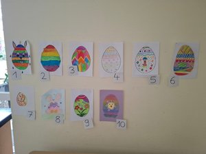 Doch damit nicht genug: Aus den vielen kleinen Kunstwerken wurde ein echter Wettbewerb: In der ersten Runde hatten die Klassen die wichtige Aufgabe, die schönsten Eier einer jeweils anderen Klasse zu küren. Gar nicht so leicht bei so vielen kreativen Meisterwerken! Am Ende schafften es aus jeder Klasse die fünf beliebtesten Eier in die nächste Runde. Somit entstanden unsere glorreichen Top 20.